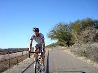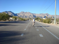 tucson ist gross, sehr gross für schweizer verhältnisse. da wäre mal schon nur der stadtdurchmesser! beim heutigen radtraining hatten wir am schluss fast 80km auf dem tacho für "einmal durch die stadt und zurück"! wobei die stadt hier so weit und offen ist, dass es nicht wirklich einen stadtcharakter hat. die strassen sind natürlich auch ziemlich gross gebaut, denn pick-up-trucks brauchen platz, und nicht wenig;-) trotzdem ist die region sehr velofreundlich, fast jede strasse hat einen velostreifen, sei es eine 2-spurige landstrasse oder eine 6-spurige stadtstrasse. nach einer coupierten strecke am samstag, gings für mich gestern richtung mt.lemmon hoch. auf dem höchsten punkt auf 2800müm gibts das südlichste skigebiet nordamerikas, dort wollte ich eigentlich hin mit dem velo. aber auf ca. 2000müm wurde die strasse immer winterlicher und ich wendete sicherheitshalber und brauste die lange abfahrt hinunter. die passstrasse ist ganz anders gebaut als in den schweizer alpen. weniger steil, viel breiter und praktisch ohne spitzkehren, ist somit etwas weniger spannend zu fahren. dafür entschädigte einem der tief- und panoramablick auf die stadt tucson und die wüste in richtung mexiko! jaja, amerika zum velöle ist anders, aber durchaus interessant;-) das wetter machte auch eine bergfahrt. von 8°C am samstag hatten wir heute ganze 28°C, also von den winterklamotten direkt in die sommermontur! ist natürlich super, genau so haben wir uns das wetter im sonnenstaat arizona vorgestellt, wolkenlos und warm!
